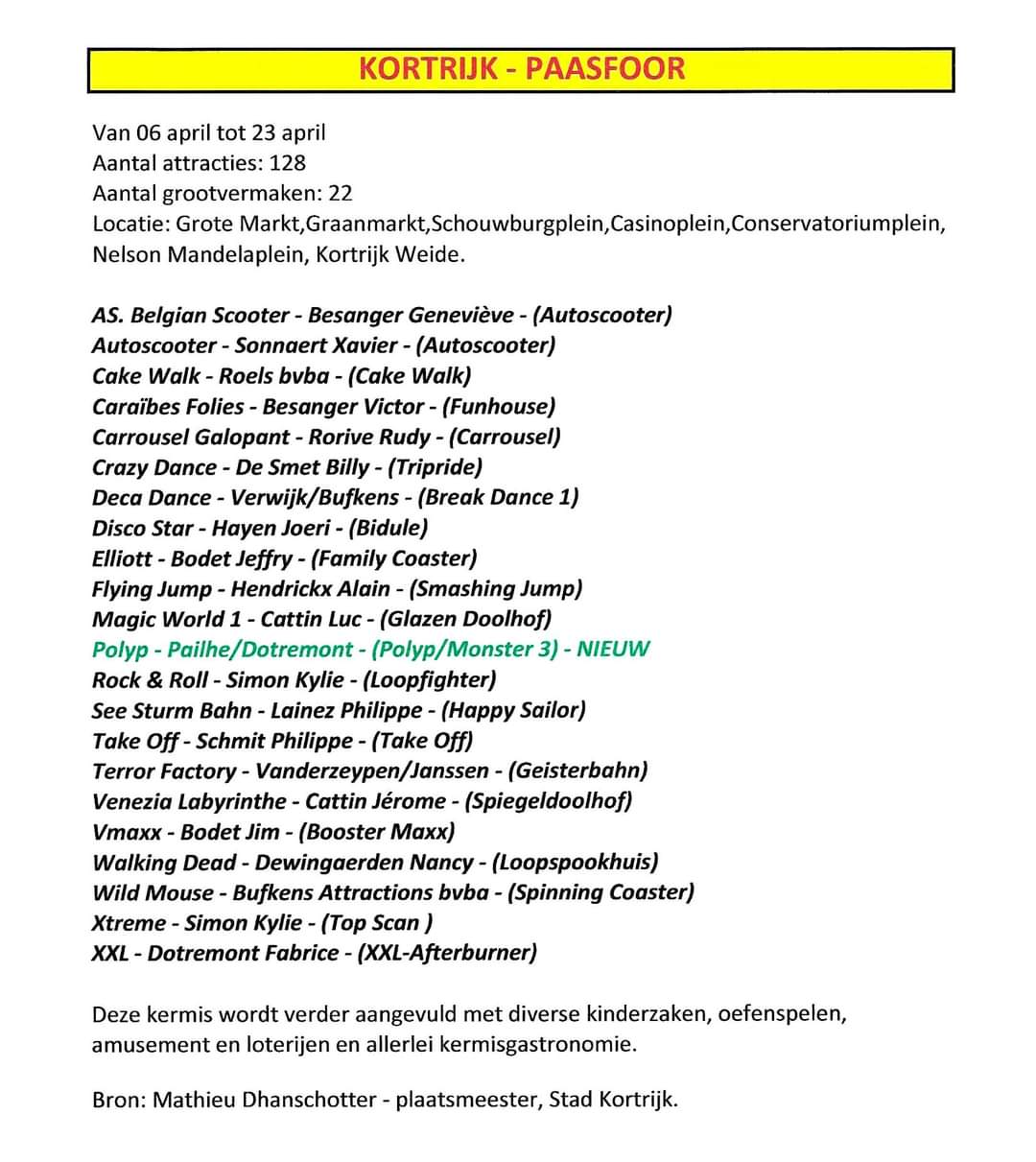 KERMIS ATTRACTIESLIJSTEN BELGIE APRIL